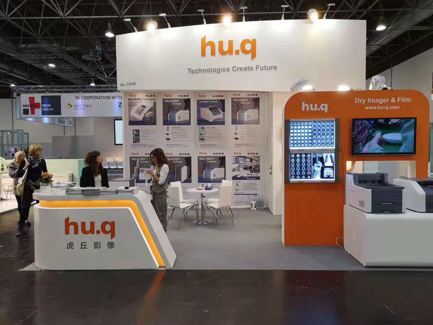 本次MEDICA展會吸引了來自130多個國際和地區(qū)的5000多家公司前來參展。虎丘影像的展臺位于H12-F60, 展臺風(fēng)格簡潔、大方,以橙色和白色基調(diào)為主,輔以燈光映射,在展區(qū)顯得尤為突出。