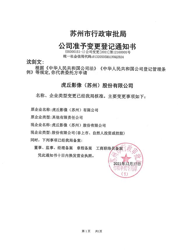 12月17日,經(jīng)蘇州市行政審批局核準(zhǔn),公司名稱(chēng)正式變更為“虎丘影像(蘇州)股份有限公司”,此次變更,是虎丘影像在企業(yè)發(fā)展歷程和上市進(jìn)程中又一里程碑。