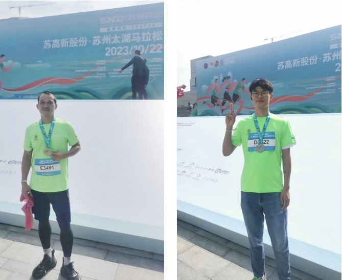 參加半馬的兩位員工到達(dá)終點(diǎn),獲得獎(jiǎng)牌